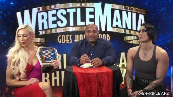 | Home > Screen Captures > Interviews > ESPN MMA: WWE WrestleMania 39: Charlotte Flair & Rhea Ripley sit down with Daniel Cormier |