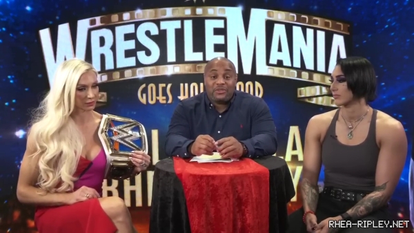 | Home > Screen Captures > Interviews > ESPN MMA: WWE WrestleMania 39: Charlotte Flair & Rhea Ripley sit down with Daniel Cormier |