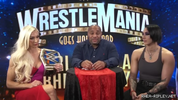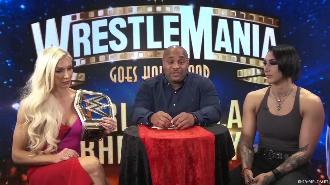 | Home > Screen Captures > Interviews > ESPN MMA: WWE WrestleMania 39: Charlotte Flair & Rhea Ripley sit down with Daniel Cormier |