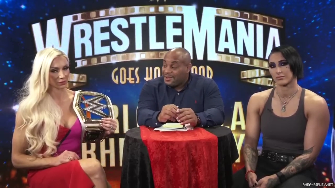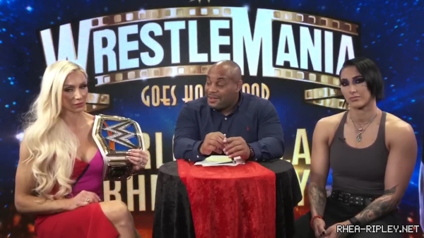 | Home > Screen Captures > Interviews > ESPN MMA: WWE WrestleMania 39: Charlotte Flair & Rhea Ripley sit down with Daniel Cormier |
