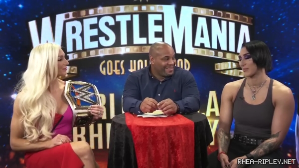| Home > Screen Captures > Interviews > ESPN MMA: WWE WrestleMania 39: Charlotte Flair & Rhea Ripley sit down with Daniel Cormier |