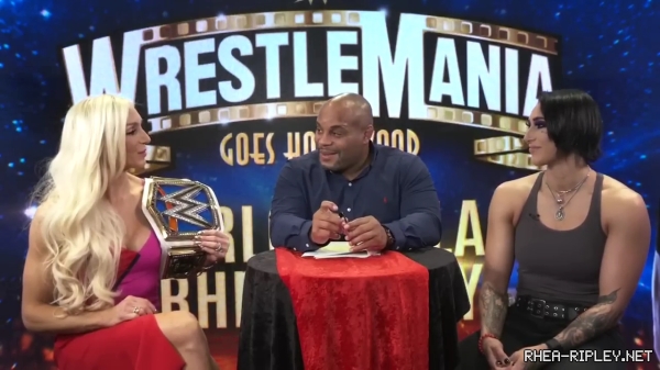 | Home > Screen Captures > Interviews > ESPN MMA: WWE WrestleMania 39: Charlotte Flair & Rhea Ripley sit down with Daniel Cormier |