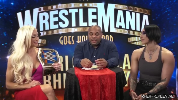 | Home > Screen Captures > Interviews > ESPN MMA: WWE WrestleMania 39: Charlotte Flair & Rhea Ripley sit down with Daniel Cormier |