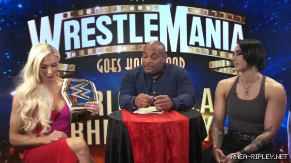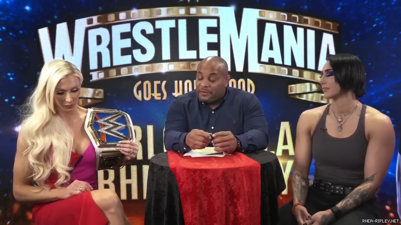 | Home > Screen Captures > Interviews > ESPN MMA: WWE WrestleMania 39: Charlotte Flair & Rhea Ripley sit down with Daniel Cormier |