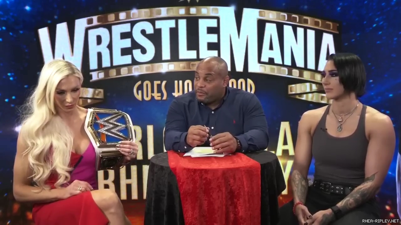 | Home > Screen Captures > Interviews > ESPN MMA: WWE WrestleMania 39: Charlotte Flair & Rhea Ripley sit down with Daniel Cormier |