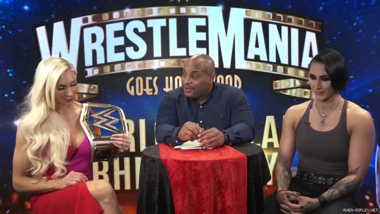 | Home > Screen Captures > Interviews > ESPN MMA: WWE WrestleMania 39: Charlotte Flair & Rhea Ripley sit down with Daniel Cormier |